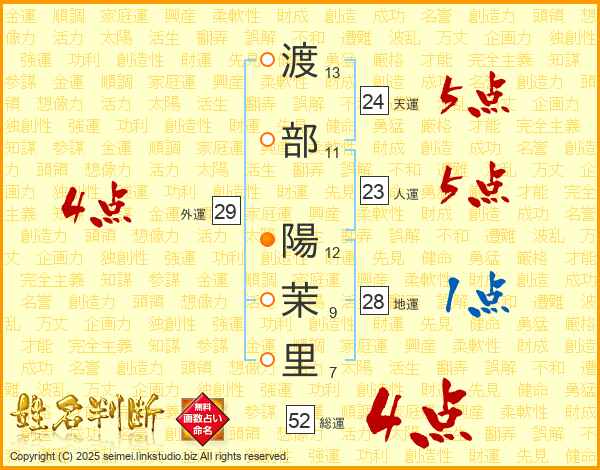 渡(13画)部(11画) 陽(12画)茉(9画)里(7画)