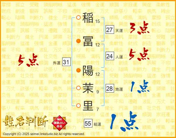 稲(15画)冨(12画) 陽(12画)茉(9画)里(7画)