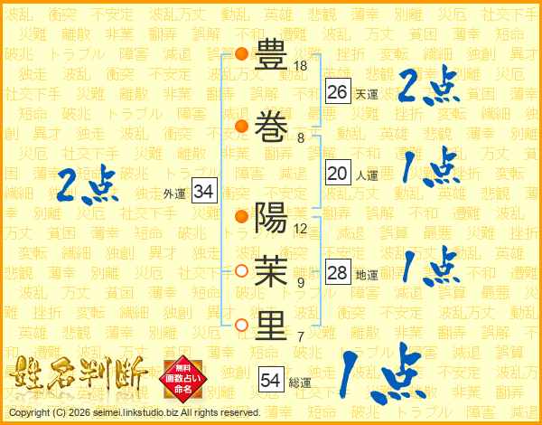 豊(18画)巻(8画) 陽(12画)茉(9画)里(7画)