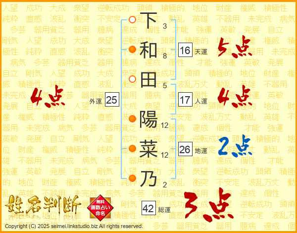 下(3画)和(8画)田(5画) 陽(12画)菜(12画)乃(2画)