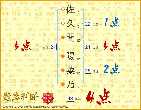 佐(7画)久(3画)間(12画) 陽(12画)菜(12画)乃(2画)