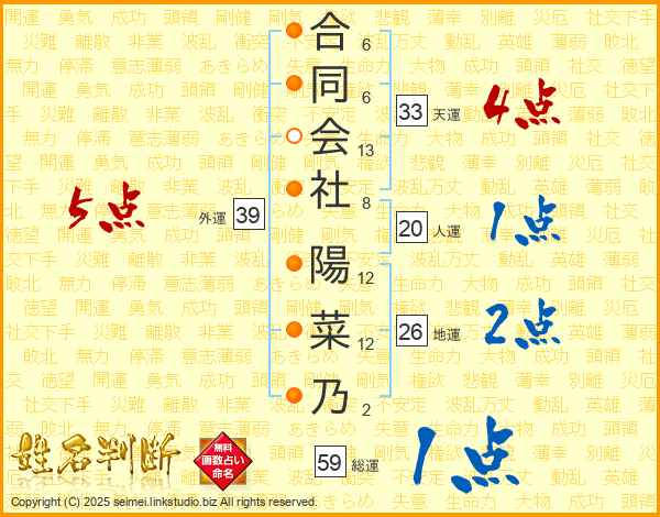 合(6画)同(6画)会(13画)社(8画) 陽(12画)菜(12画)乃(2画)