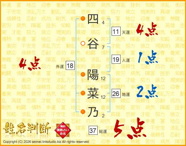 四谷陽菜乃さんの総運は37画の5点!