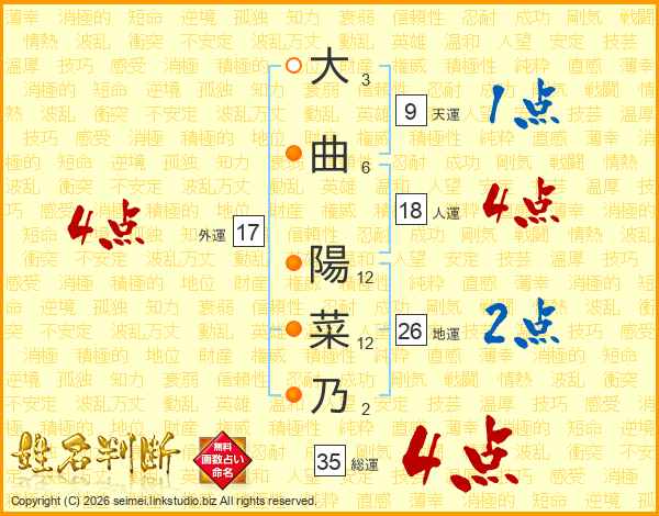 大(3画)曲(6画) 陽(12画)菜(12画)乃(2画)