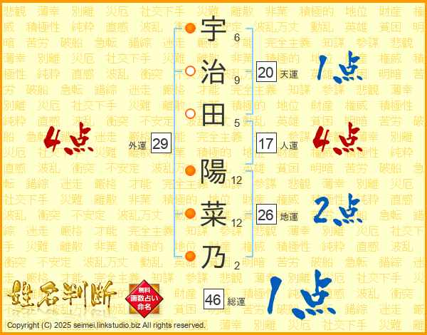 宇(6画)治(9画)田(5画) 陽(12画)菜(12画)乃(2画)