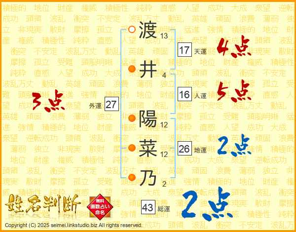 渡(13画)井(4画) 陽(12画)菜(12画)乃(2画)