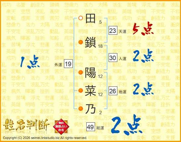 田(5画)鎖(18画) 陽(12画)菜(12画)乃(2画)