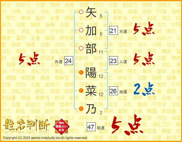 矢(5画)加(5画)部(11画) 陽(12画)菜(12画)乃(2画)