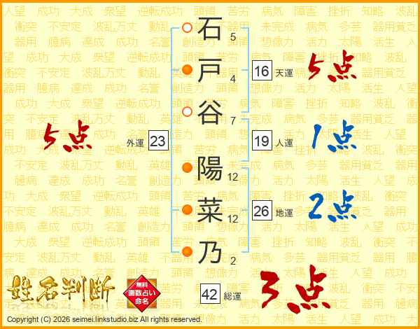 石(5画)戸(4画)谷(7画) 陽(12画)菜(12画)乃(2画)