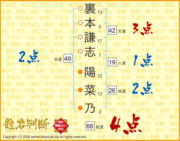 裏本謙志陽菜乃さんの総運は68画の4点!