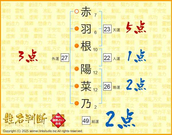 赤(7画)羽(6画)根(10画) 陽(12画)菜(12画)乃(2画)