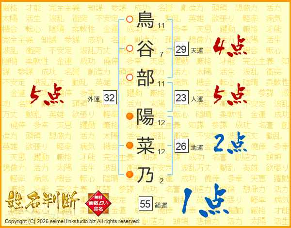 鳥(11画)谷(7画)部(11画) 陽(12画)菜(12画)乃(2画)