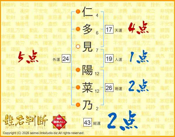 仁(4画)多(6画)見(7画) 陽(12画)菜(12画)乃(2画)