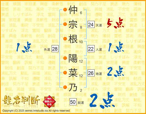 仲(6画)宗(8画)根(10画) 陽(12画)菜(12画)乃(2画)
