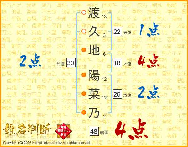 渡(13画)久(3画)地(6画) 陽(12画)菜(12画)乃(2画)