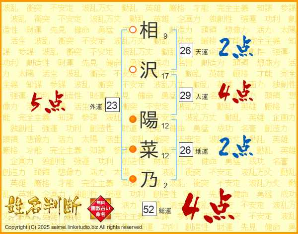 相(9画)沢(17画) 陽(12画)菜(12画)乃(2画)