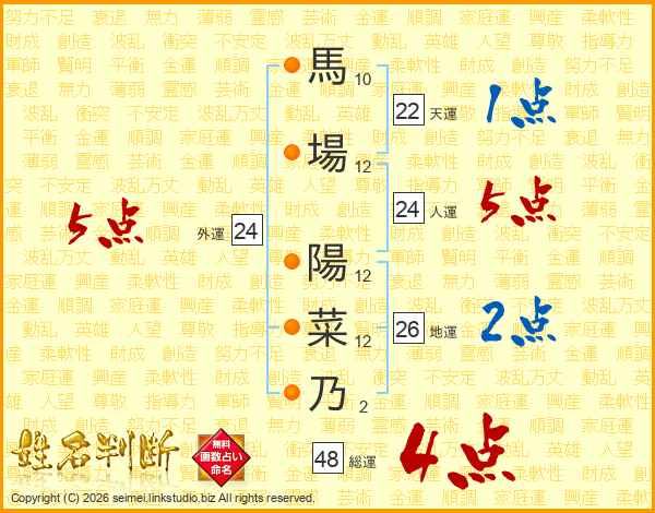 馬場陽菜乃さんの外運は24画の5点!
