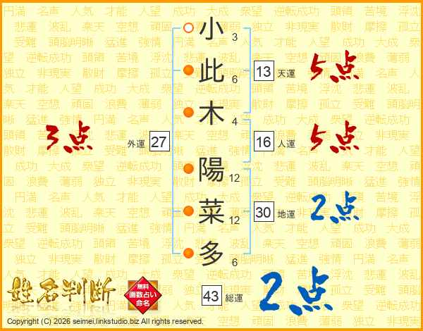 小此木陽菜多さんの総運は43画の2点!