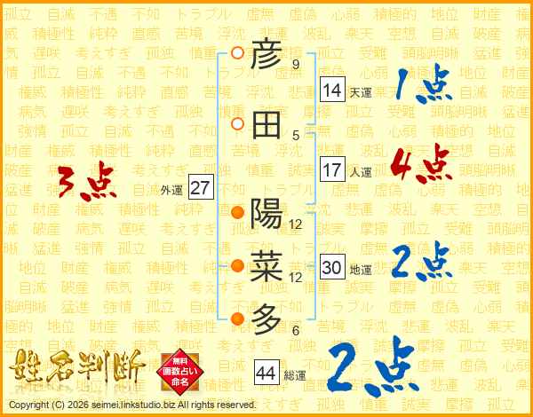 彦(9画)田(5画) 陽(12画)菜(12画)多(6画)