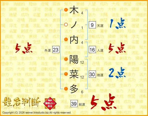 木ノ内陽菜多さんの総運は39画の5点!