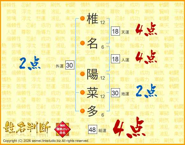 椎(12画)名(6画) 陽(12画)菜(12画)多(6画)
