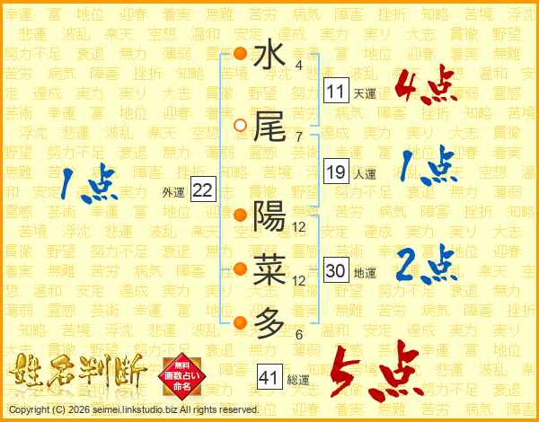 水尾陽菜多さんの総運は41画の5点!