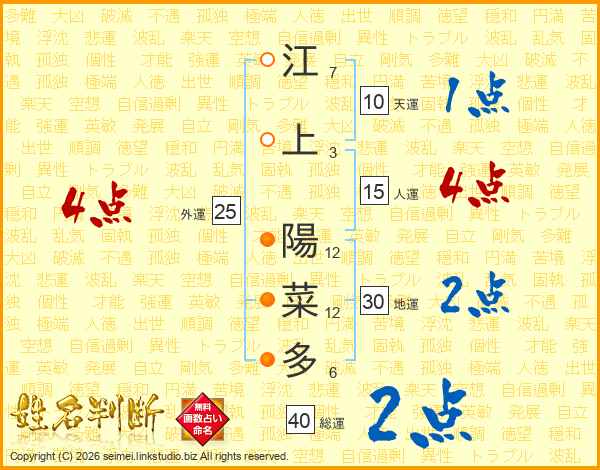 江(7画)上(3画) 陽(12画)菜(12画)多(6画)