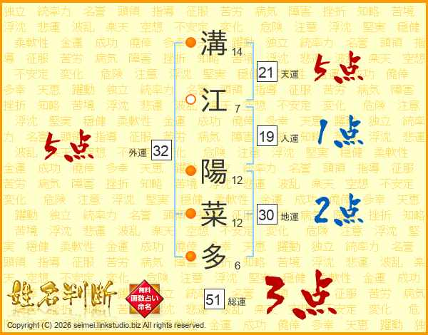 生活面を象徴する運勢です。外部から受ける影響力を表し、結婚運、家庭運や職場、環境への順応性を表します。総運から人運を引いた画数。姓や名が1文字の場合を除く。