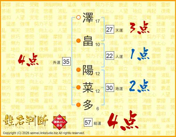 澤畠陽菜多さんの総運は57画の4点!