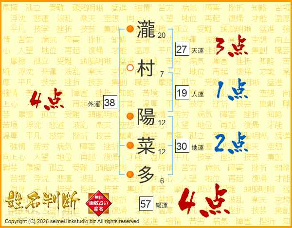 瀧村陽菜多さんの総運は57画の4点!
