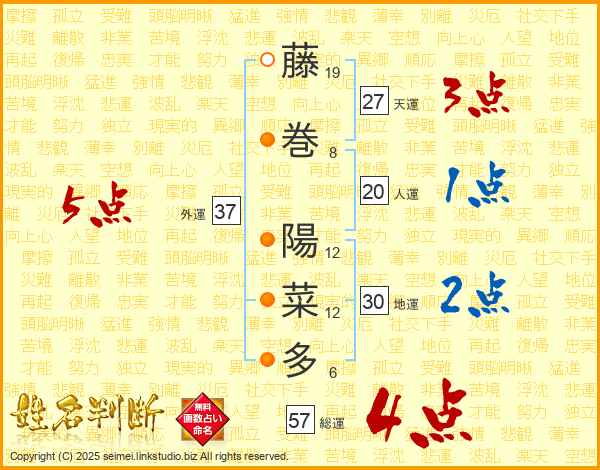 藤(19画)巻(8画) 陽(12画)菜(12画)多(6画)