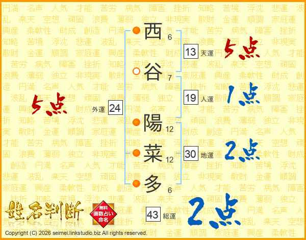 西(6画)谷(7画) 陽(12画)菜(12画)多(6画)