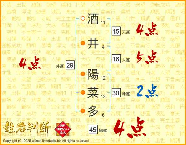 酒(11画)井(4画) 陽(12画)菜(12画)多(6画)