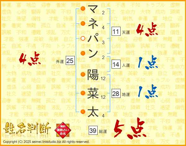 マ(2画)ネ(4画)パ(3画)ン(2画) 陽(12画)菜(12画)太(4画)