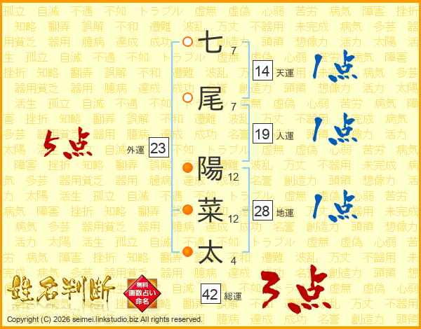 七(7画)尾(7画) 陽(12画)菜(12画)太(4画)