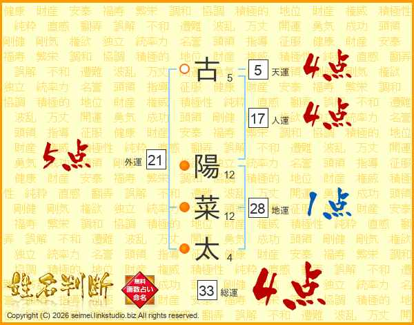 古陽菜太さんの総運は33画の4点!