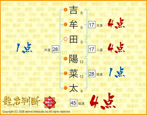 吉(6画)牟(6画)田(5画) 陽(12画)菜(12画)太(4画)