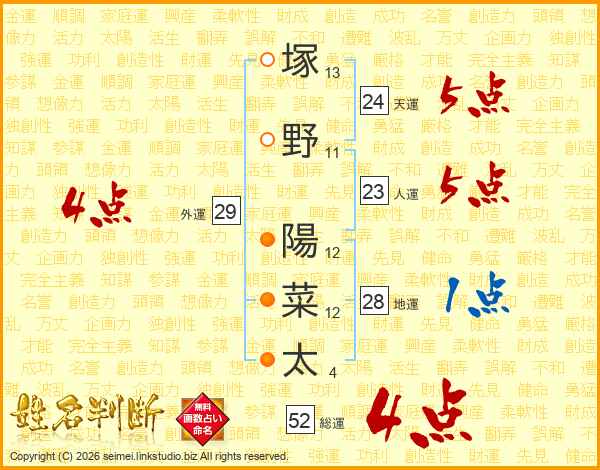 塚野陽菜太さんの総運は52画の4点!