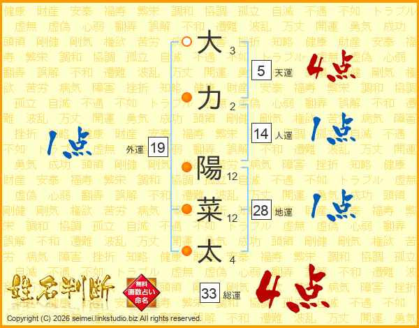 大力陽菜太さんの総運は33画の4点!