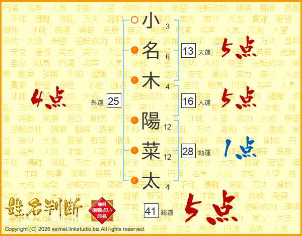 小(3画)名(6画)木(4画) 陽(12画)菜(12画)太(4画)