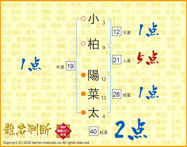 小(3画)柏(9画) 陽(12画)菜(12画)太(4画)