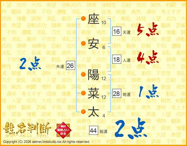 座(10画)安(6画) 陽(12画)菜(12画)太(4画)