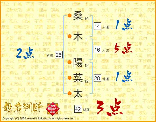 桑(10画)木(4画) 陽(12画)菜(12画)太(4画)