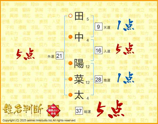 田(5画)中(4画) 陽(12画)菜(12画)太(4画)