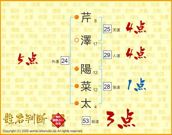 芹澤陽菜太さんの天運は25画の4点!