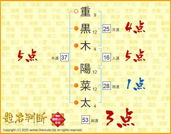 重黒木陽菜太さんの総運は53画の3点!