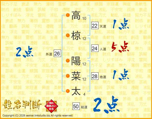 高(10画)椋(12画) 陽(12画)菜(12画)太(4画)