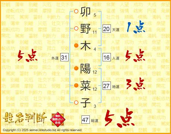 卯野木陽菜子さんの総運は47画の5点!