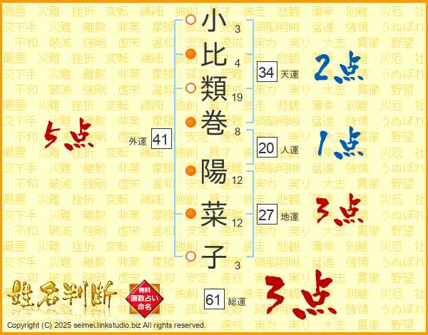 小(3画)比(4画)類(19画)巻(8画) 陽(12画)菜(12画)子(3画)
