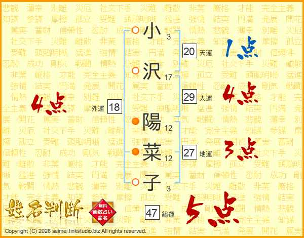 小(3画)沢(17画) 陽(12画)菜(12画)子(3画)